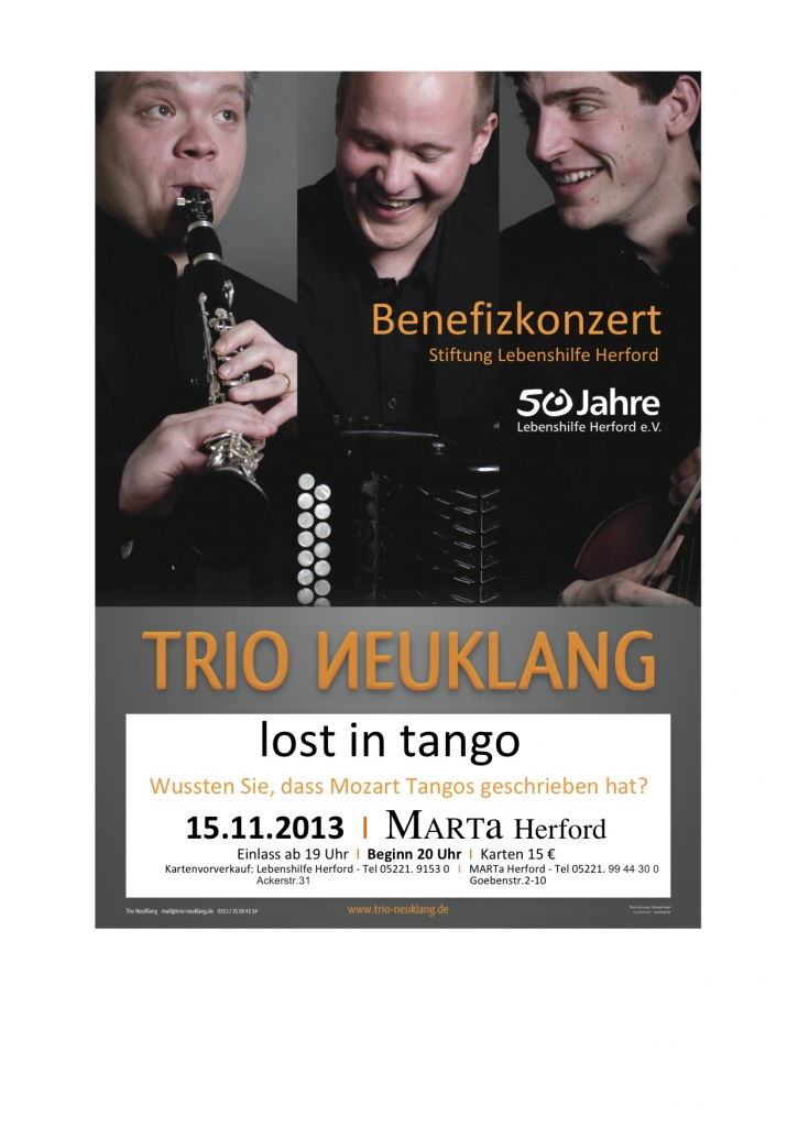 „Trio Neuklang“ aus Berlin mit einem grandiosen Programm: „lost in tango“ mit Kompositionen von Piazzolla arrangiert mit Werken klassischer Komponisten. Die Musiker verzichteten weitgehend auf ihre Gage, die Museumsdirektion auf die Saalmiete, Freunde und Förderer der Lebenshilfe übernahmen sonstige Kosten und spendeten für die Stiftung. Sie sicherten damit langfristige Unterstützungen, z.B. für das Projekt Musiktherapie für Menschen mit Behinderung.