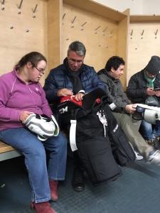 die Schutzausrüstung „probetragen.“ Dabei lernten sie, dass der Puck in etwa 170 km/h schnell werden kann und genauso schwer ist, wie der Stock, mit dem er geschossen wird.