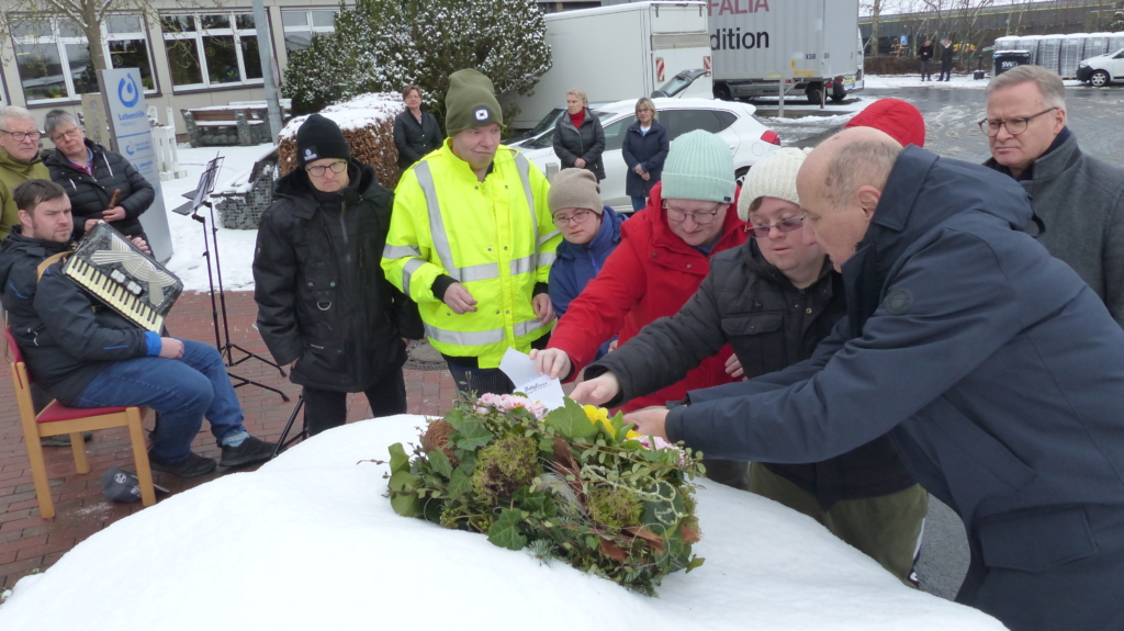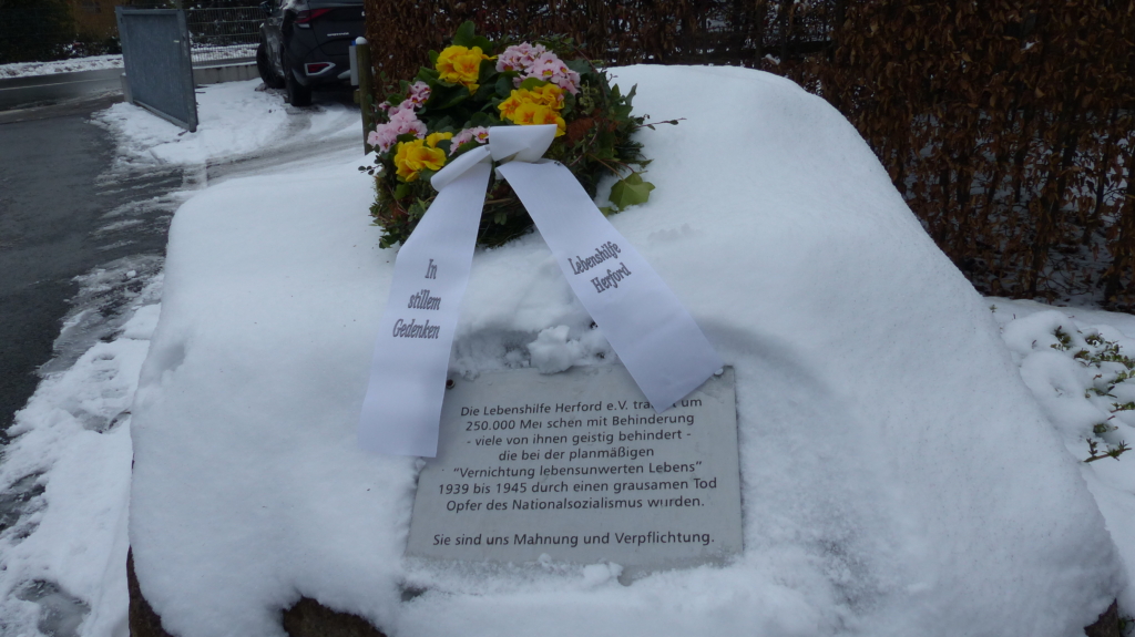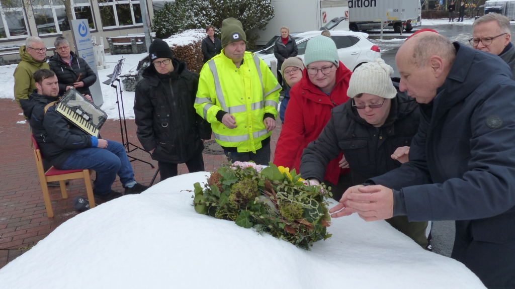 Zum stillen Gedenken wurde gemeinsam mit Menschen mit Unterstützungsbedarf ein Kranz auf dem Gedenkstein vor den Herforder Werkstätten an der Ackerstraße niedergelegt.