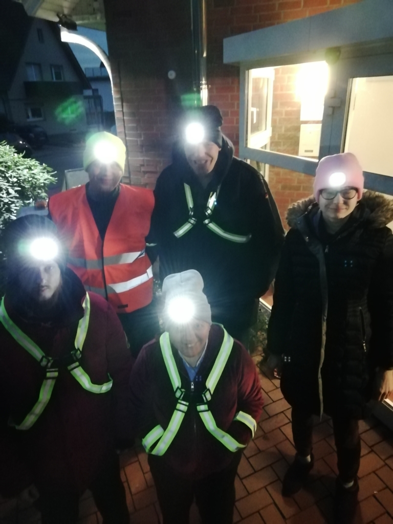 Nach Spendeneingang wurde umgehend eine große „Leucht- und Reflektorbestellung“ aufgegeben. LED-Mützen, reflektierende Westen, reflektierende Gurte und Armbänder sowie die von der Tranemo Workwear zur Verfügung gestellten Warnwesten samt Reflektor Anhängern wurden über unsere Wohnhausleitungen an die Bewohnenden verteilt.